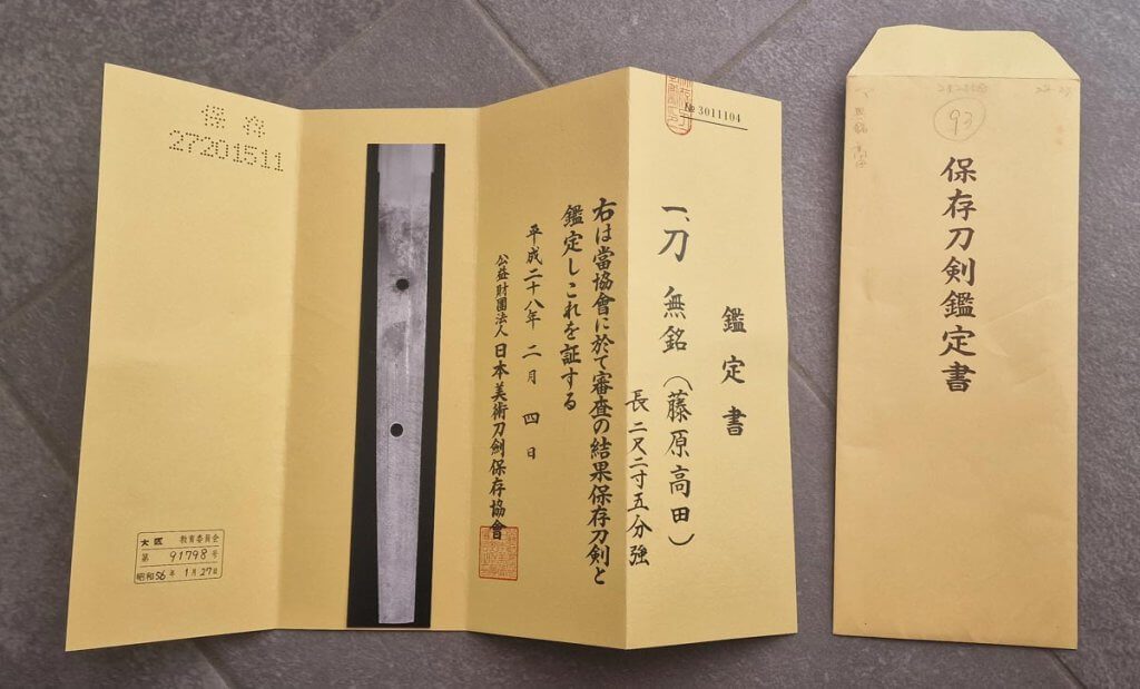 The sword was professionally restored in 2019, and is in possession of genuine Japanese papers and is registered with the local sword authority NBTHK under the number 91798 in Japan.