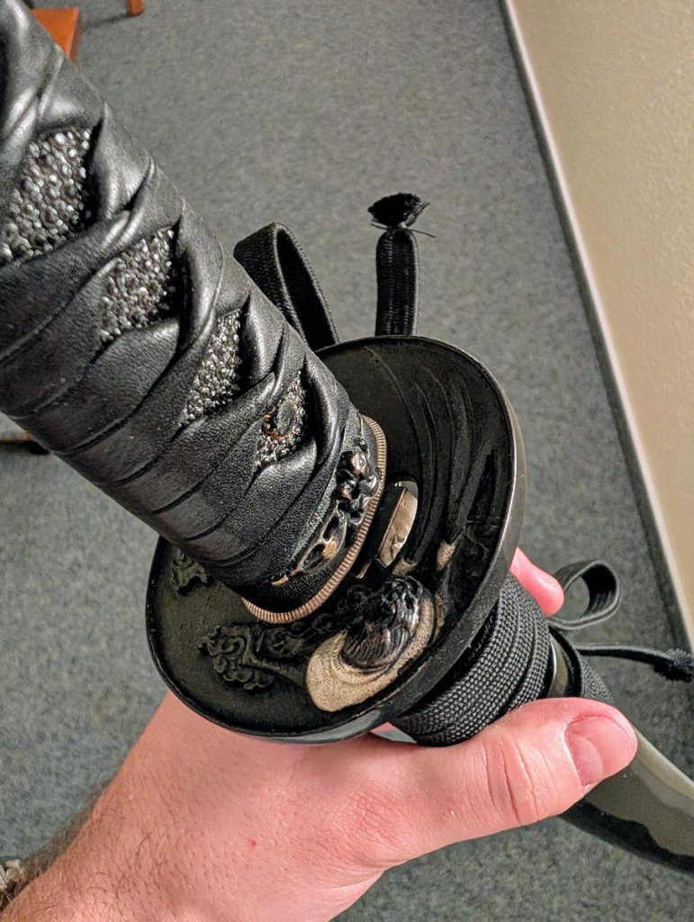 Black leather tsukagawa (leather handle) and traditional kakugata tsuba (sword blade).
