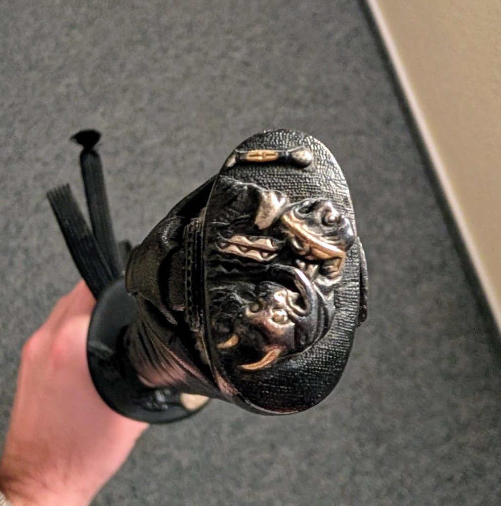 The entire mount of this sword (koshirae) with various oni (Japanese 鬼 demon motif) hannya and futen motifs is a reproduction of antique Japanese swords on display in Japanese museums.