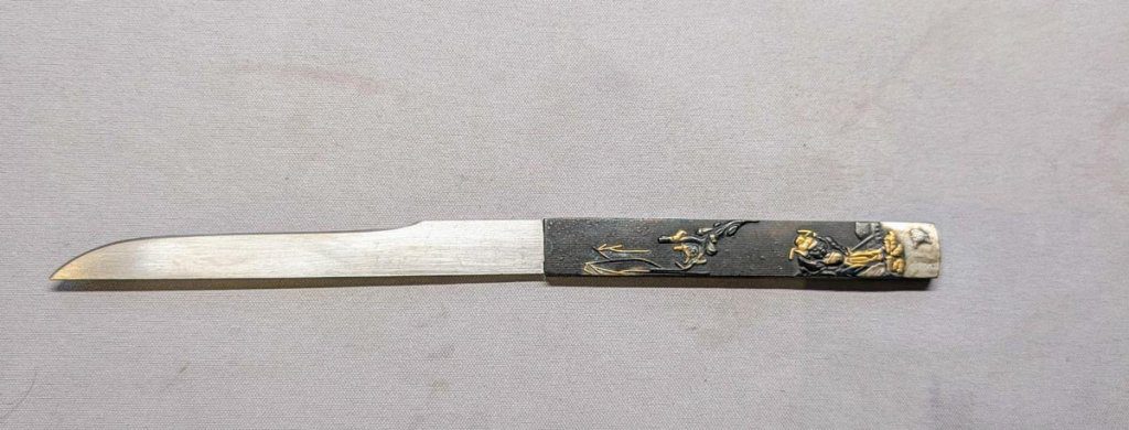 A kogatana "(small) knife" with a kozuka "small handle" with an oni theme is inserted into a special recess in the saya (sheath) of the sword.