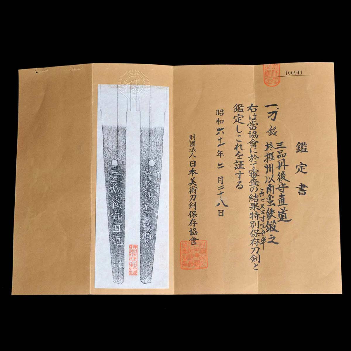 En raison de sa qualité et de son bon état, le sabre a reçu le statut Tokubetsu (particulièrement digne d'être conservé) de la NBTHK. Le certificat de ce statut est inclus dans l'offre.