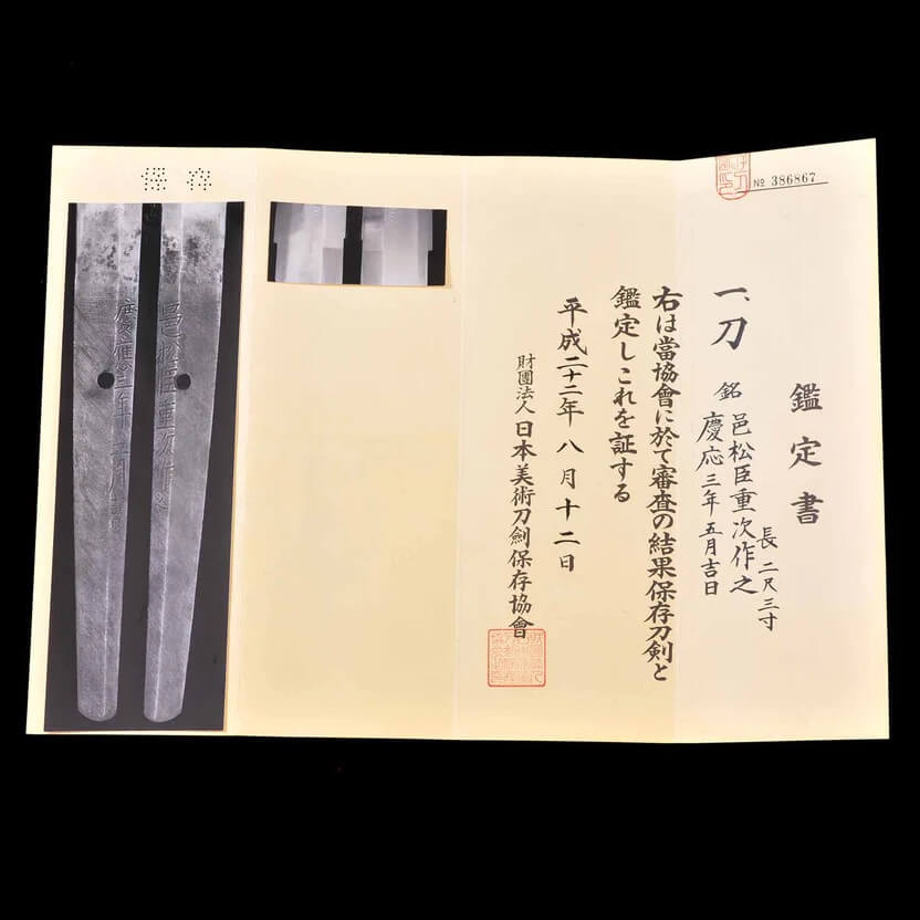 La NBTHK classe l'épée dans la catégorie "Hozon", c'est-à-dire digne d'être conservée. Le certificat correspondant fait partie de l'offre.
