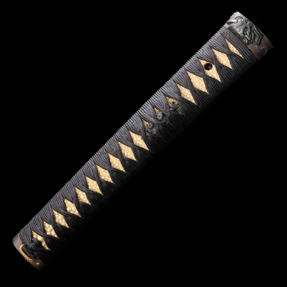La monture (Koshirae) possède également des papiers verts Tokubetsu Kicho ! Avec fourreau de sabre laqué rouge-brun avec kizami et tsukaito en soie, enroulé dans du tsumami-maki.