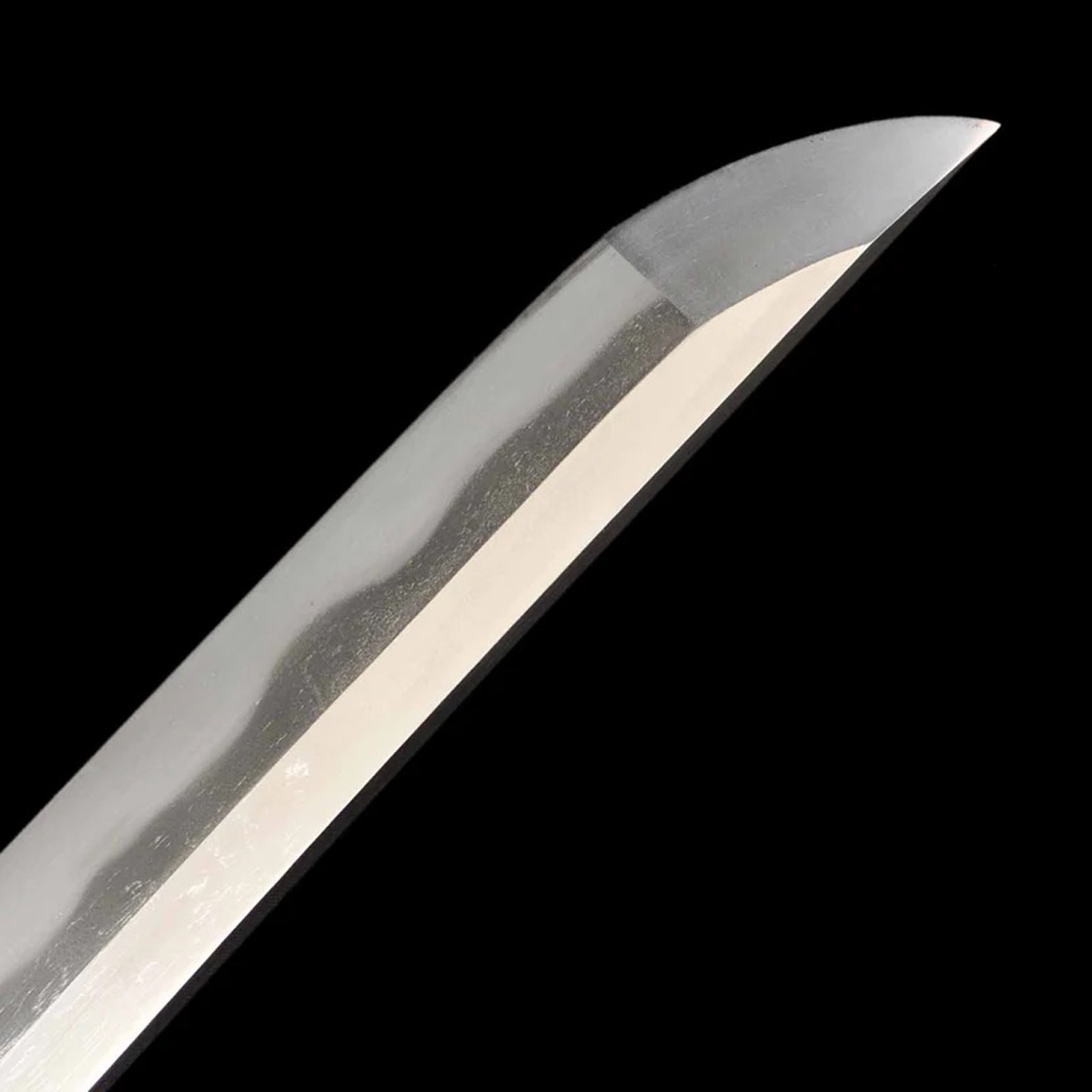 Le hada est Itame avec des chikei et des yubashiri très actifs. Le hamon est Midare, avec un nioi et un sunagashi visibles.